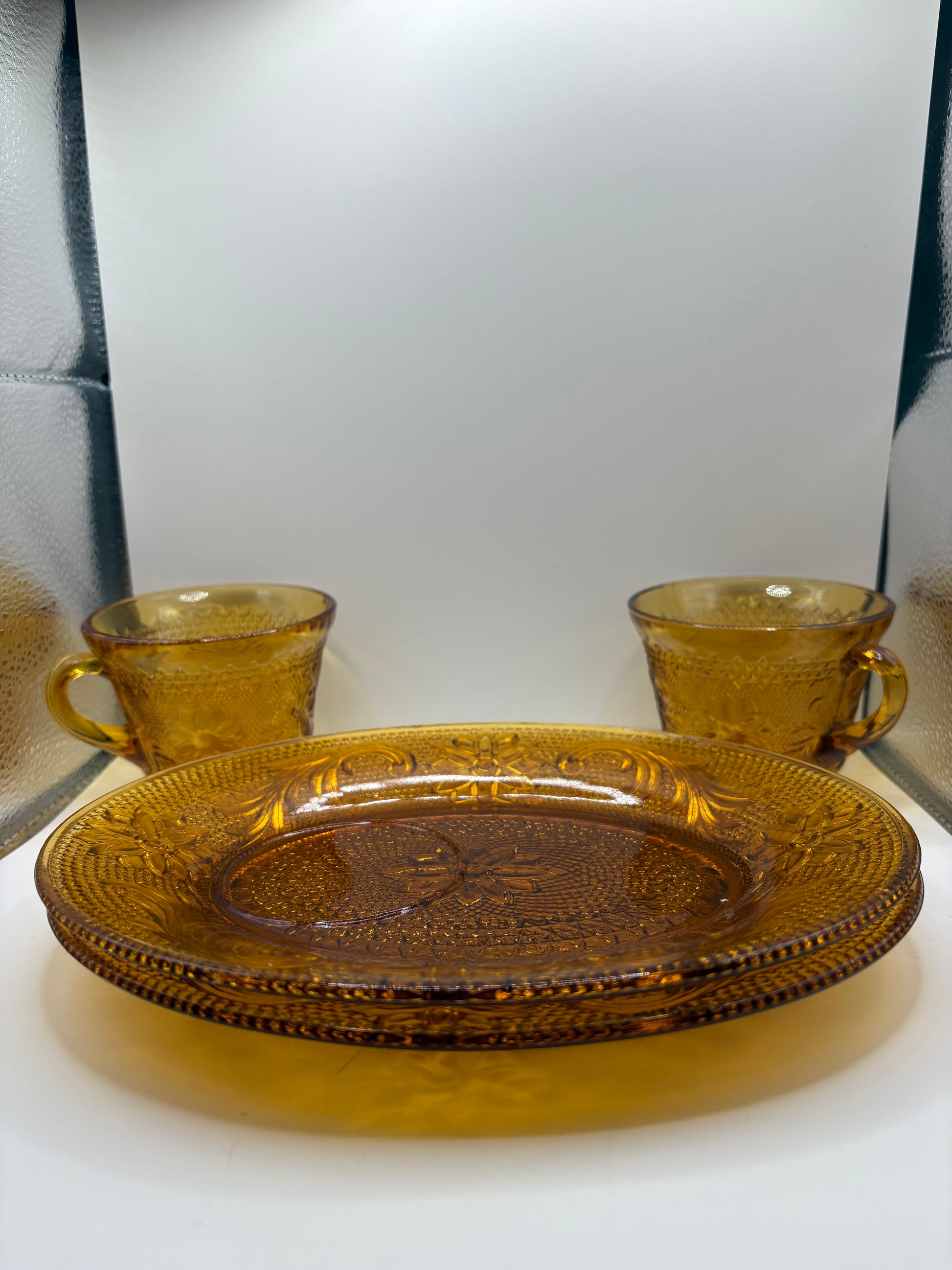Vintage Lot (4 Pieces) oof Indiana Glass, 2 Tiara Sandwich Pattern Snack Plate and Cup Set in Amber Glass